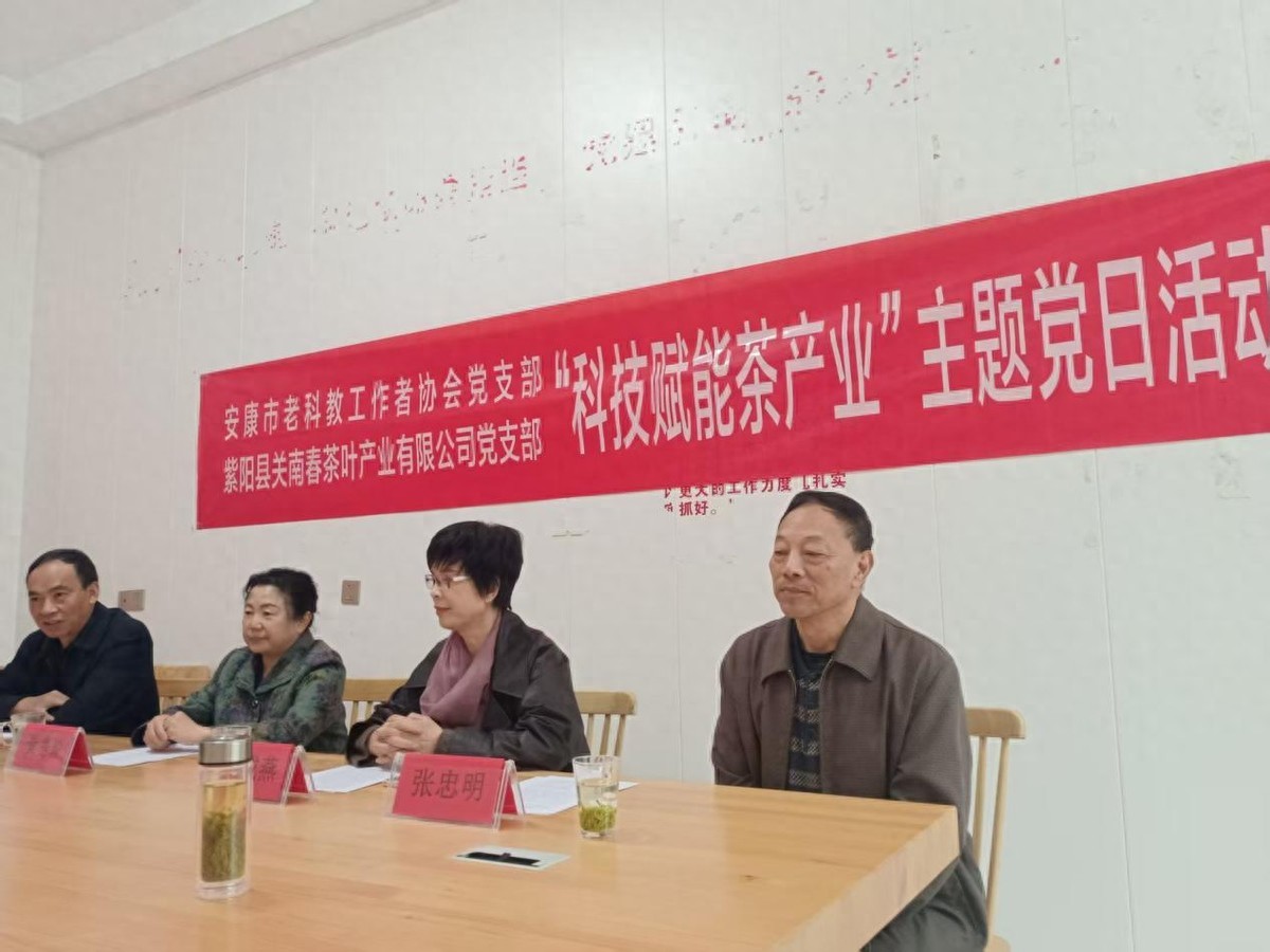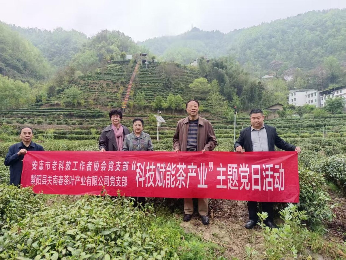 4月8日,春光明媚,阳光灿烂。安康市老科协党支部与紫阳县关南春茶产叶有限公司党支部联合开展“科技赋能茶产业”主题党日活动。市老科協会长黄秀玲、副会长邹成燕、顾问赵昆、党支部书记张忠民一行4人来到紫阳县关南春茶产业公司与公司党支部全体党员共同参加活动。